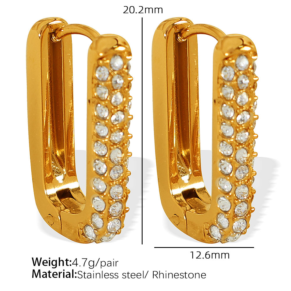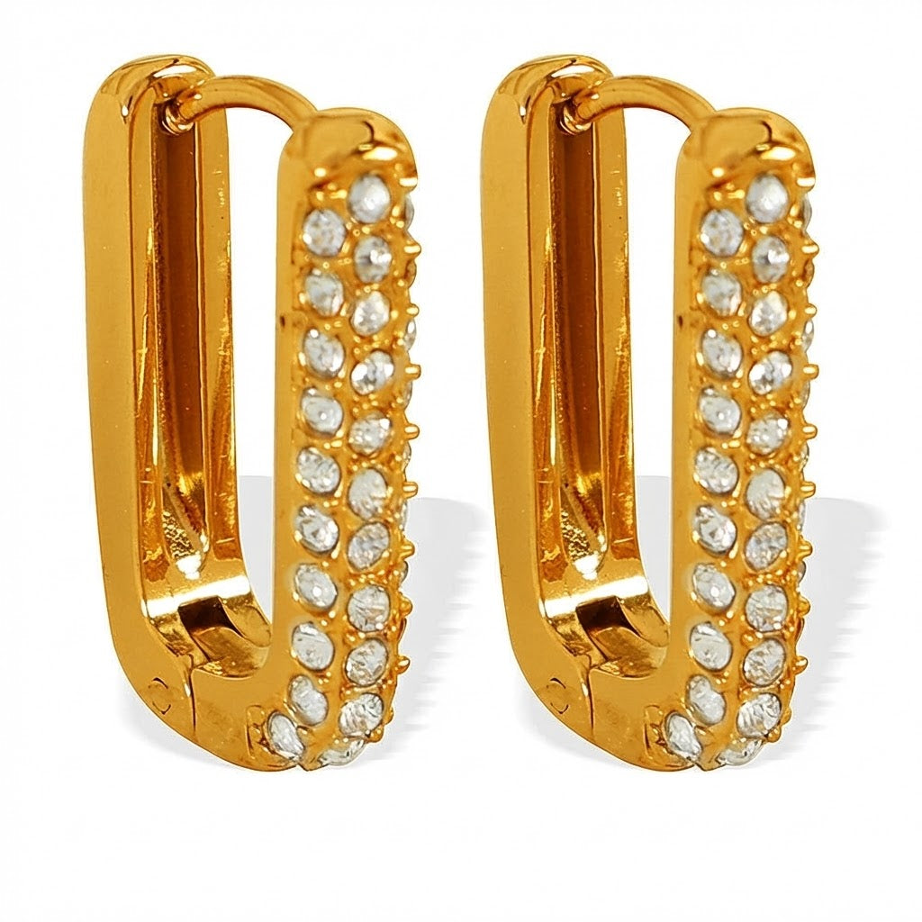 A sophisticated pair of gold-plated stainless steel huggie hoop earrings adorned with pavé-set emerald green stones. Designed with a sleek, modern structure , these hoops offer a luxurious yet everyday-wearable appeal. They are lightweight and comfortable while ensuring durability with their stainless steel base. The vibrant green stones add a pop of color, making these earrings perfect for both casual and elegant outfits.